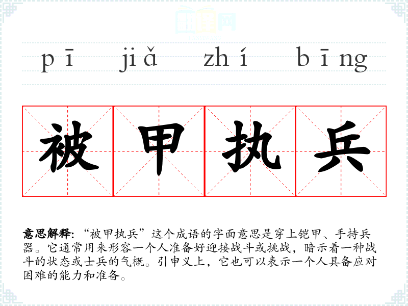 “被甲执兵”这个成语的字面意思是穿上铠甲、手持兵器。它通常用来形容一个人准备好迎接战斗或挑战,暗示着一种战斗的状态或士兵的气概。引申义上,它也可以表示一个人具备应对困难的能力和准备。