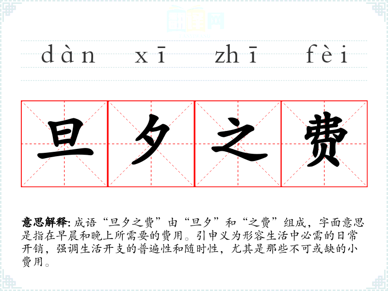 成语“旦夕之费”由“旦夕”和“之费”组成,字面意思是指在早晨和晚上所需要的费用。引申义为形容生活中必需的日常开销,强调生活开支的普遍性和随时性,尤其是那些不可或缺的小费用。