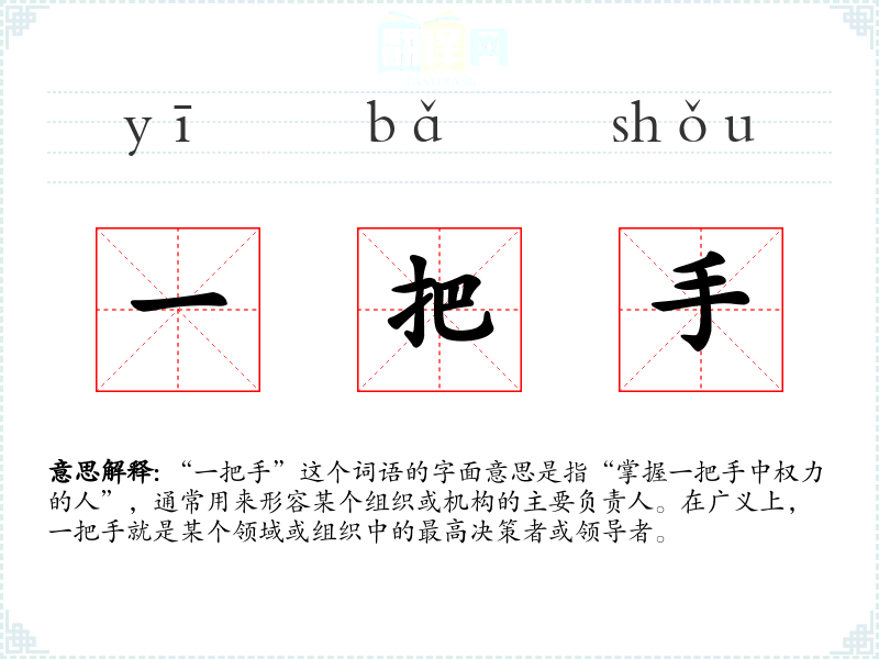 “一把手”这个词语的字面意思是指“掌握一把手中权力的人”,通常用来形容某个组织或机构的主要负责人。在广义上,一把手就是某个领域或组织中的最高决策者或领导者。