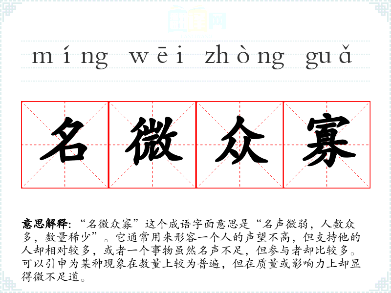 “名微众寡”这个成语字面意思是“名声微弱,人数众多,数量稀少”。它通常用来形容一个人的声望不高,但支持他的人却相对较多,或者一个事物虽然名声不足,但参与者却比较多。可以引申为某种现象在数量上较为普遍,但在质量或影响力上却显得微不足道。