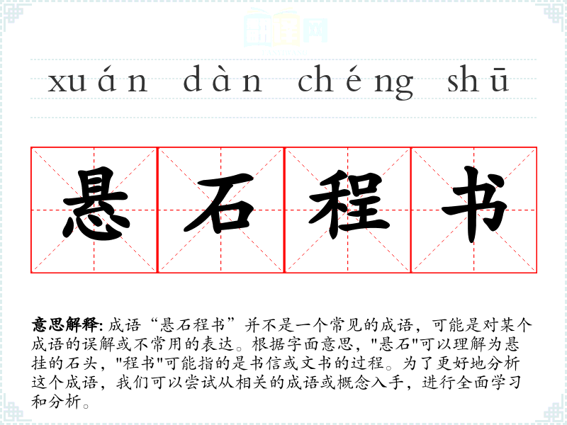 成语“悬石程书”并不是一个常见的成语,可能是对某个成语的误解或不常用的表达。根据字面意思,"悬石"可以理解为悬挂的石头,"程书"可能指的是书信或文书的过程。为了更好地分析这个成语,我们可以尝试从相关的成语或概念入手,进行全面学习和分析。