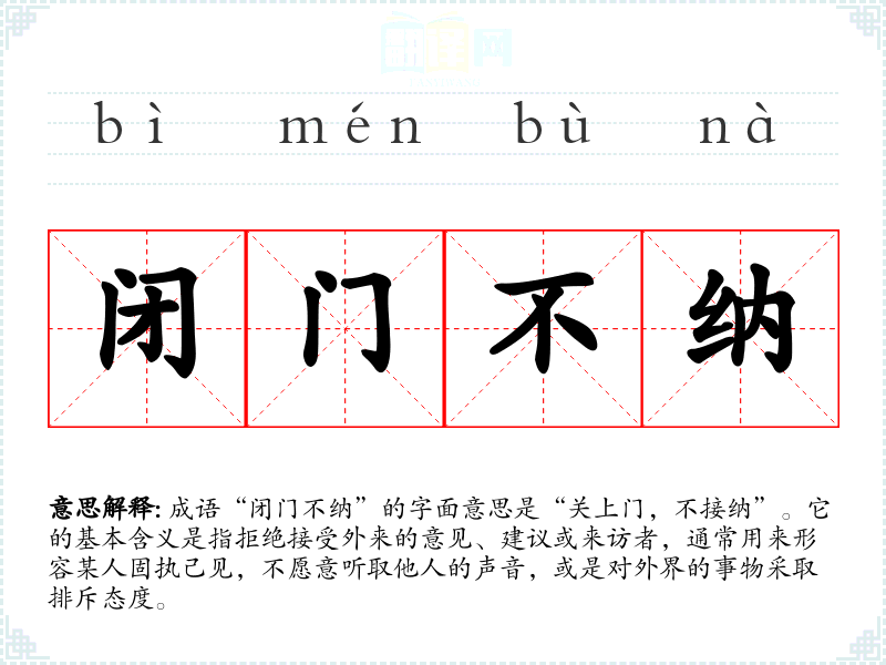 成语“闭门不纳”的字面意思是“关上门,不接纳”。它的基本含义是指拒绝接受外来的意见、建议或来访者,通常用来形容某人固执己见,不愿意听取他人的声音,或是对外界的事物采取排斥态度。
