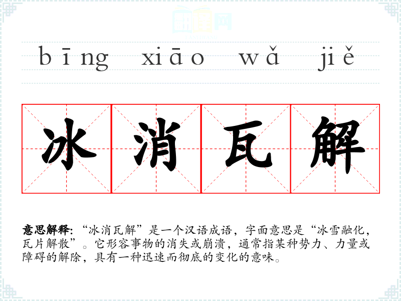 “冰消瓦解”的确切来源并不明确,但它常常被用来形容事物的消失与崩溃,尤其是在古代文学中,常见于描写自然变化和社会动荡的场景中。成语中“冰”象征着坚硬的事物,而“瓦”则是脆弱的物质,二者结合强调了变化的戏剧性。