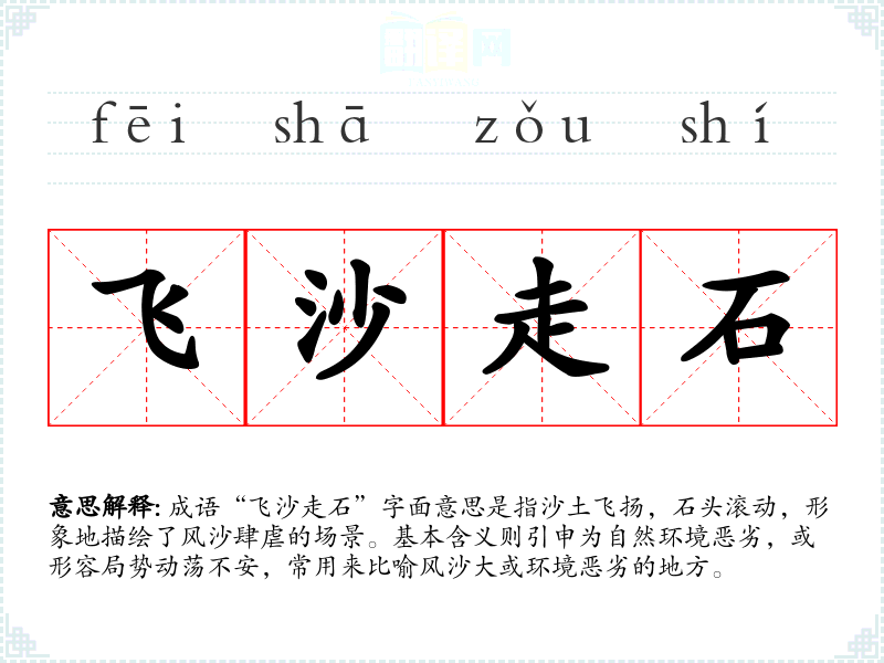 “飞沙走石”最早见于唐代诗人王维的《使至塞上》,其中提到“无边落木萧萧下,不尽长江滚滚来”,反映出边塞地区风沙的壮观与恶劣环境。这个成语的使用,体现了对自然环境的深刻观察与表达。