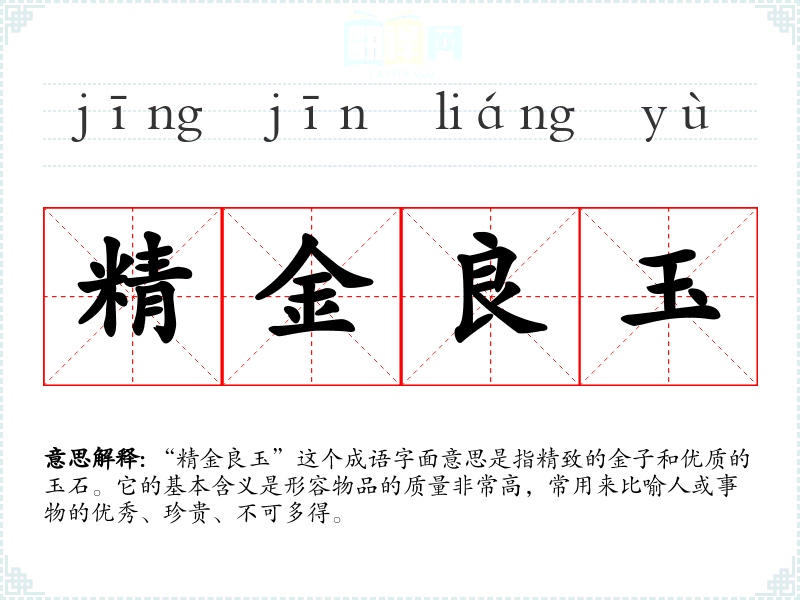 “精金良玉”这个成语字面意思是指精致的金子和优质的玉石。它的基本含义是形容物品的质量非常高,常用来比喻人或事物的优秀、珍贵、不可多得。