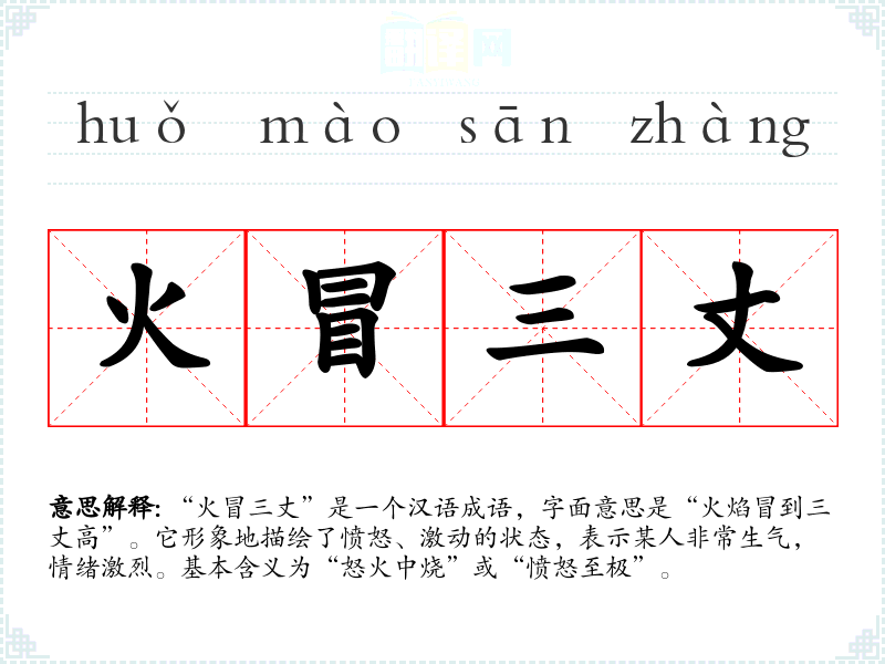 “火冒三丈”是一个汉语成语,字面意思是“火焰冒到三丈高”。它形象地描绘了愤怒、激动的状态,表示某人非常生气,情绪激烈。基本含义为“怒火中烧”或“愤怒至极”。