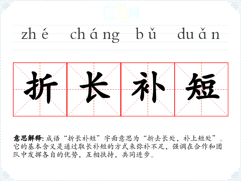 成语“折长补短”字面意思为“折去长处,补上短处”。它的基本含义是通过取长补短的方式来弥补不足,强调在合作和团队中发挥各自的优势,互相扶持,共同进步。