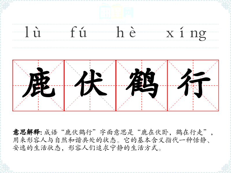 成语“鹿伏鹤行”字面意思是“鹿在伏卧,鹤在行走”,用来形容人与自然和谐共处的状态。它的基本含义指代一种恬静、安逸的生活状态,形容人们追求宁静的生活方式。