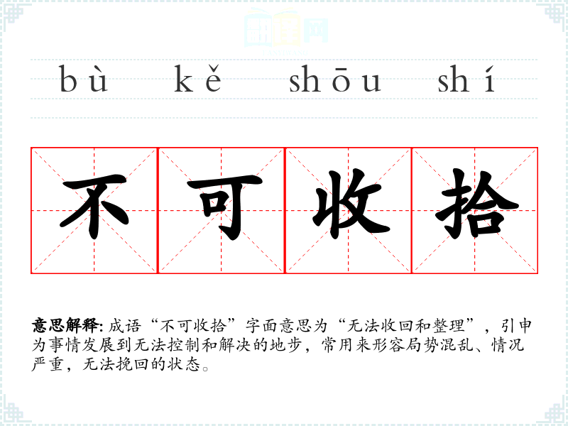成语“不可收拾”字面意思为“无法收回和整理”,引申为事情发展到无法控制和解决的地步,常用来形容局势混乱、情况严重,无法挽回的状态。