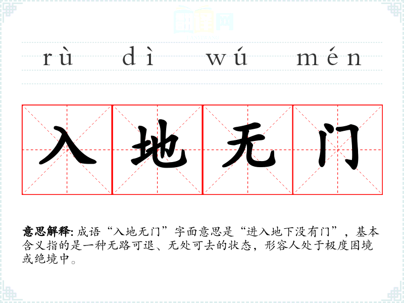 成语“入地无门”字面意思是“进入地下没有门”,基本含义指的是一种无路可退、无处可去的状态,形容人处于极度困境或绝境中。