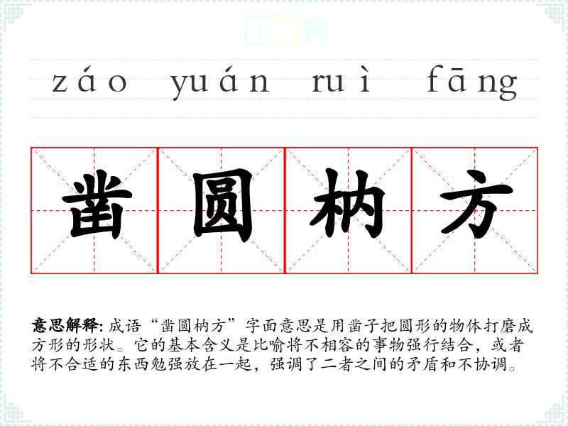 成语“凿圆枘方”字面意思是用凿子把圆形的物体打磨成方形的形状。它的基本含义是比喻将不相容的事物强行结合,或者将不合适的东西勉强放在一起,强调了二者之间的矛盾和不协调。