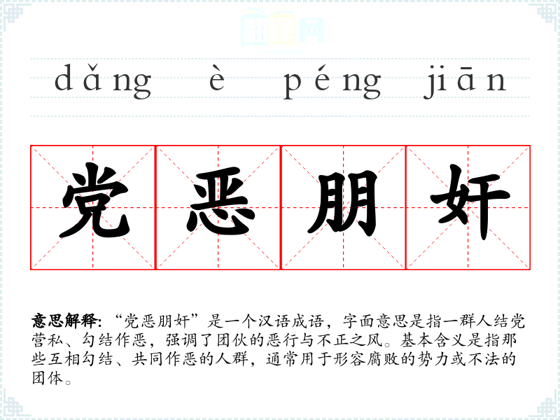 “党恶朋奸”是一个汉语成语,字面意思是指一群人结党营私、勾结作恶,强调了团伙的恶行与不正之风。基本含义是指那些互相勾结、共同作恶的人群,通常用于形容腐败的势力或不法的团体。