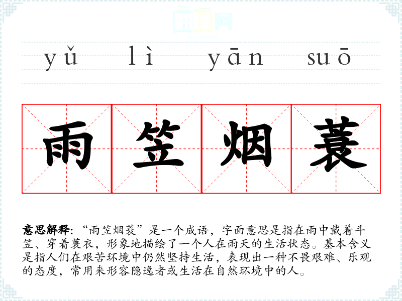 “雨笠烟蓑”是一个成语,字面意思是指在雨中戴着斗笠、穿着蓑衣,形象地描绘了一个人在雨天的生活状态。基本含义是指人们在艰苦环境中仍然坚持生活,表现出一种不畏艰难、乐观的态度,常用来形容隐逸者或生活在自然环境中的人。