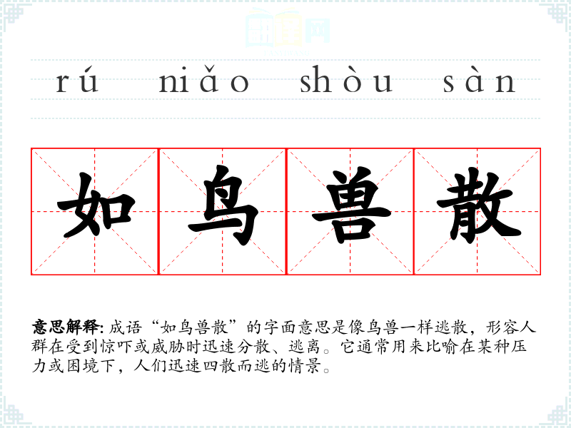 成语“如鸟兽散”的字面意思是像鸟兽一样逃散,形容人群在受到惊吓或威胁时迅速分散、逃离。它通常用来比喻在某种压力或困境下,人们迅速四散而逃的情景。