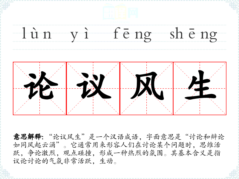 “论议风生”并没有明确的历史典故或文学出处,可能是后来的文人根据“论议”的常用语境和“风生”所传达的活跃气氛而创造的成语。可以理解为在古代文学作品中,常常会出现对辩论和讨论的描写,反映出当时文人墨客思想交锋的情景。