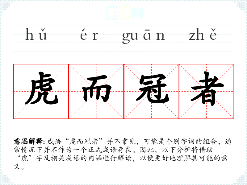成语“虎而冠者”并不常见,可能是个别字词的组合,通常情况下并不作为一个正式成语存在。因此,以下分析将借助“虎”字及相关成语的内涵进行解读,以便更好地理解其可能的意义。