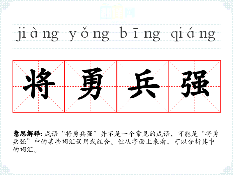 成语“将勇兵强”并不是一个常见的成语,可能是“将勇兵强”中的某些词汇误用或组合。但从字面上来看,可以分析其中的词汇。