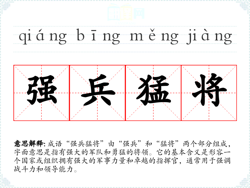 成语“强兵猛将”由“强兵”和“猛将”两个部分组成,字面意思是指有强大的军队和勇猛的将领。它的基本含义是形容一个国家或组织拥有强大的军事力量和卓越的指挥官,通常用于强调战斗力和领导能力。