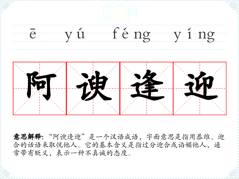 “阿谀逢迎”是一个汉语成语,字面意思是指用恭维、迎合的话语来取悦他人。它的基本含义是指过分迎合或谄媚他人,通常带有贬义,表示一种不真诚的态度。