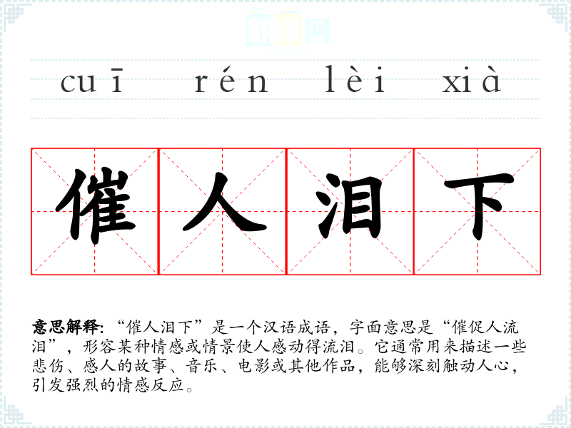 “催人泪下”是一个汉语成语,字面意思是“催促人流泪”,形容某种情感或情景使人感动得流泪。它通常用来描述一些悲伤、感人的故事、音乐、电影或其他作品,能够深刻触动人心,引发强烈的情感反应。