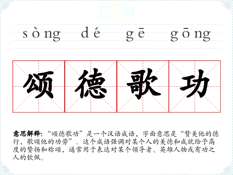 “颂德歌功”是一个汉语成语,字面意思是“赞美他的德行,歌颂他的功劳”。这个成语强调对某个人的美德和成就给予高度的赞扬和称颂,通常用于表达对某个领导者、英雄人物或有功之人的钦佩。
