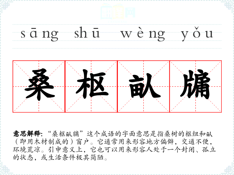 该成语的来源较为模糊,可能出自古代文献或民间传说。在古代社会,桑树常常与农村生活相联系,象征着农耕文化。成语中的“枢”和“牖”意指门窗,暗示人和外界的联系。具体的文献出处较难考证,可能是后来逐渐演变而来。