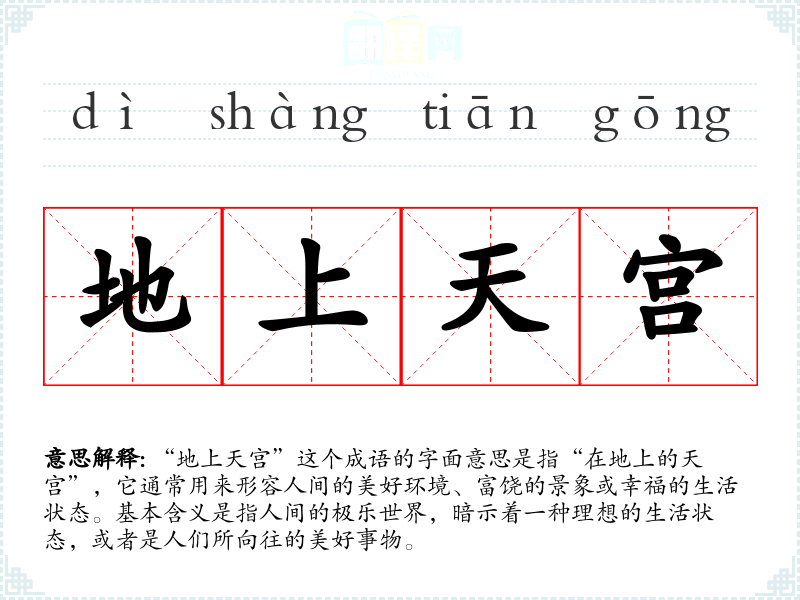 “地上天宫”这个成语的字面意思是指“在地上的天宫”,它通常用来形容人间的美好环境、富饶的景象或幸福的生活状态。基本含义是指人间的极乐世界,暗示着一种理想的生活状态,或者是人们所向往的美好事物。