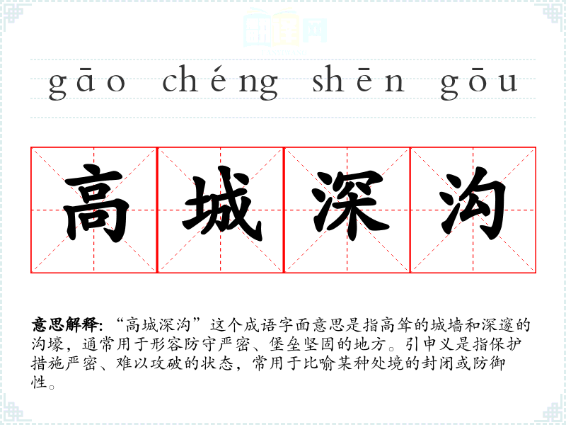 “高城深沟”这个成语字面意思是指高耸的城墙和深邃的沟壕,通常用于形容防守严密、堡垒坚固的地方。引申义是指保护措施严密、难以攻破的状态,常用于比喻某种处境的封闭或防御性。