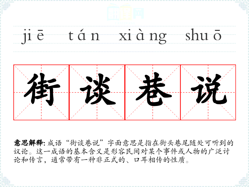 “街谈巷说”出自《红楼梦》中的一句“街谈巷说,皆是此事。”这句话说明了这一成语的历史背景,反映了当时社会中人们对某些事情的广泛关注与议论。在古代,街头巷尾的闲聊往往成为信息传播的重要途径。