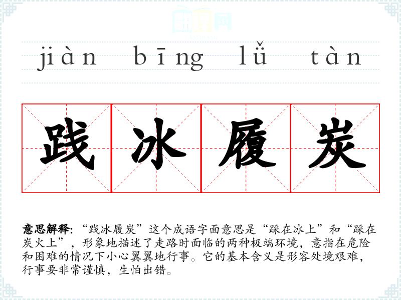 “践冰履炭”这个成语字面意思是“踩在冰上”和“踩在炭火上”,形象地描述了走路时面临的两种极端环境,意指在危险和困难的情况下小心翼翼地行事。它的基本含义是形容处境艰难,行事要非常谨慎,生怕出错。