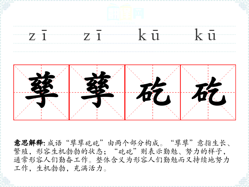 | 孳孳砽砽 | 孳孳勤勉的;砽砽辛勤劳作的样子。勤勉不懈的样子。 |