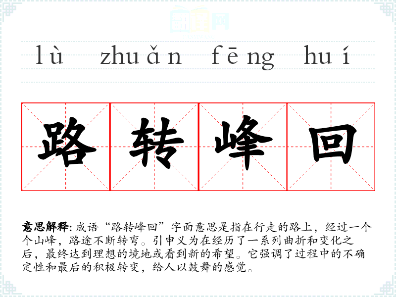 “路转峰回”出自唐代诗人王之涣的《登鹳雀楼》,其中有“白日依山尽,苍茫云海间”的描绘,反映了在旅途中遇到的美丽景色和曲折过程。成语本身强调在行进过程中所经历的变化与最终的美好结果,体现了古人对自然景观与人生哲理的思考。