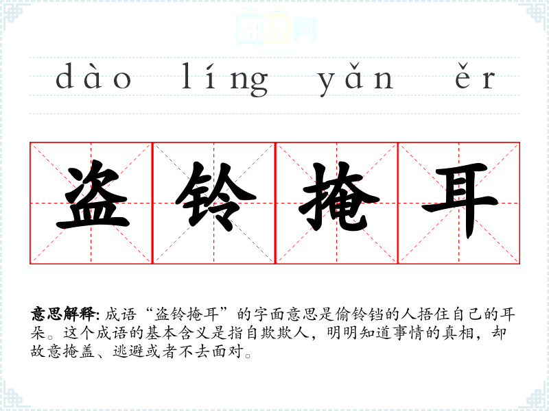 成语“盗铃掩耳”的字面意思是偷铃铛的人捂住自己的耳朵。这个成语的基本含义是指自欺欺人,明明知道事情的真相,却故意掩盖、逃避或者不去面对。