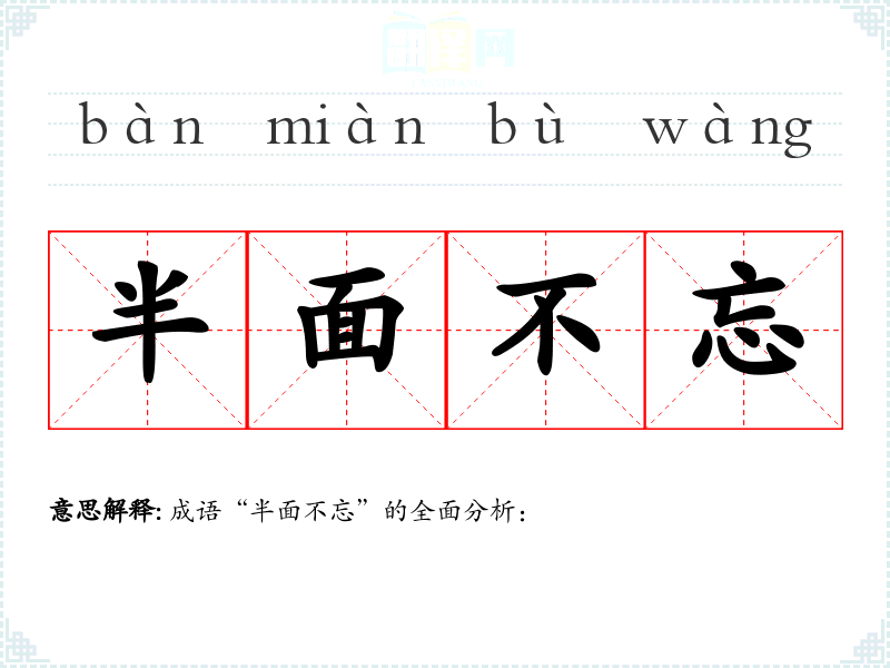 “半面不忘”字面意思为“只记得一半的面容”,引申义为对某人或某事的印象深刻,虽然记忆不全,但仍然难以忘怀。通常用于形容对过去某个特定人或事的深刻印象。