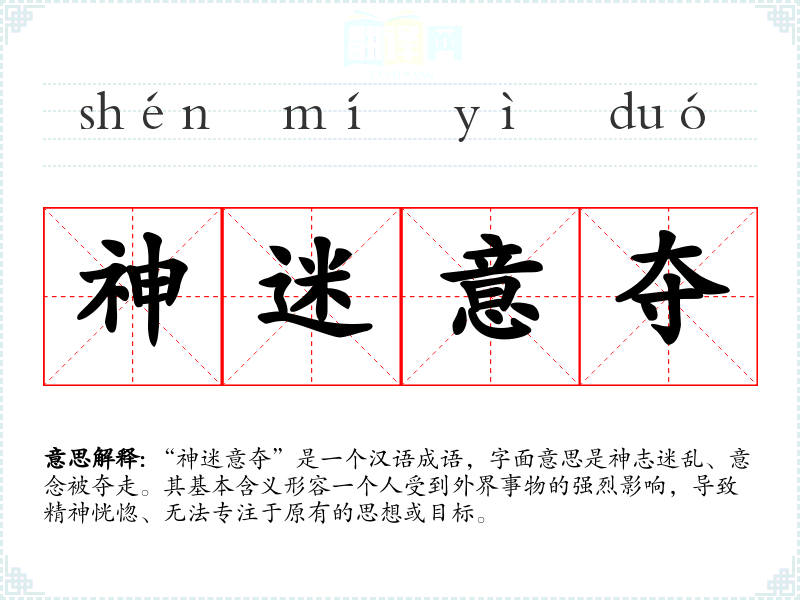 在英语中,类似的表达可以是“lost in thought”或“overwhelmed by emotions”,这些表达也传达了思维迷乱或情感过度影响的含义,但可能并没有像“神迷意夺”那样浓厚的文化背景。