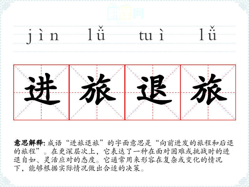 成语“进旅退旅”的字面意思是“向前进发的旅程和后退的旅程”。在更深层次上,它表达了一种在面对困难或挑战时的进退自如、灵活应对的态度。它通常用来形容在复杂或变化的情况下,能够根据实际情况做出合适的决策。