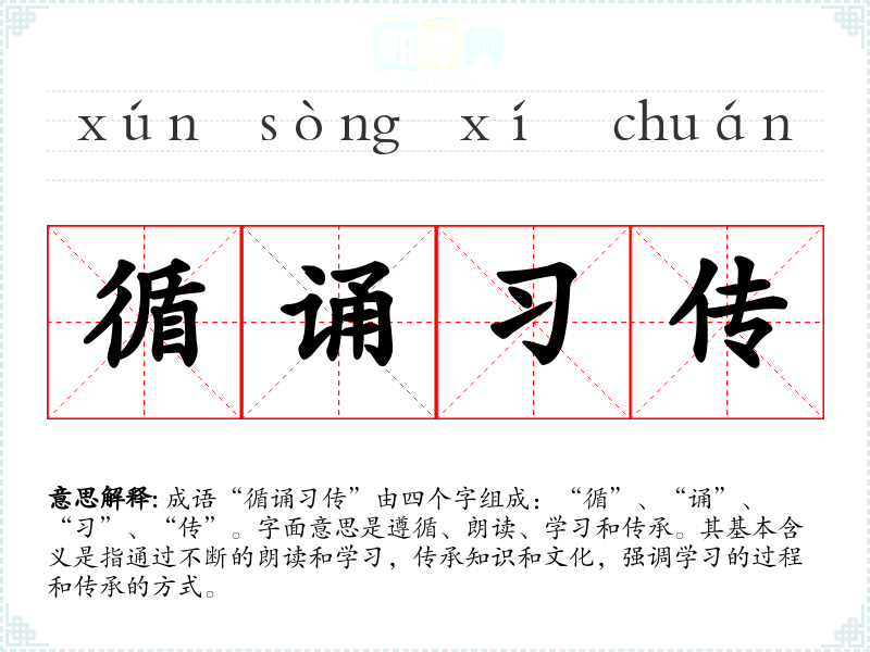 成语“循诵传”由四个字组成:“循”、“诵”、“”、“传”。字面意思是遵循、朗读、学和传承。其基本含义是指通过不断的朗读和学,传承知识和文化,强调学*的过程和传承的方式。