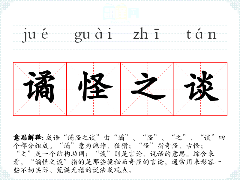 成语“谲怪之谈”由“谲”、“怪”、“之”、“谈”四个部分组成。“谲”意为诡诈、狡猾;“怪”指奇怪、古怪;“之”是一个结构助词;“谈”则是言论、说话的意思。综合来看,“谲怪之谈”指的是那些诡秘而奇怪的言论,通常用来形容一些不切实际、荒诞无稽的说法或观点。