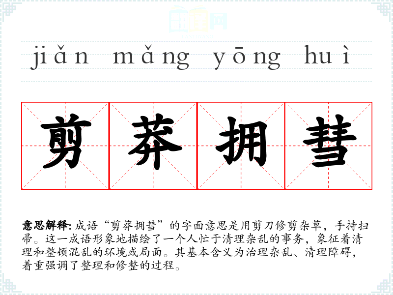 成语“剪莽拥彗”的字面意思是用剪刀修剪杂草,手持扫帚。这一成语形象地描绘了一个人忙于清理杂乱的事务,象征着清理和整顿混乱的环境或局面。其基本含义为治理杂乱、清理障碍,着重强调了整理和修整的过程。