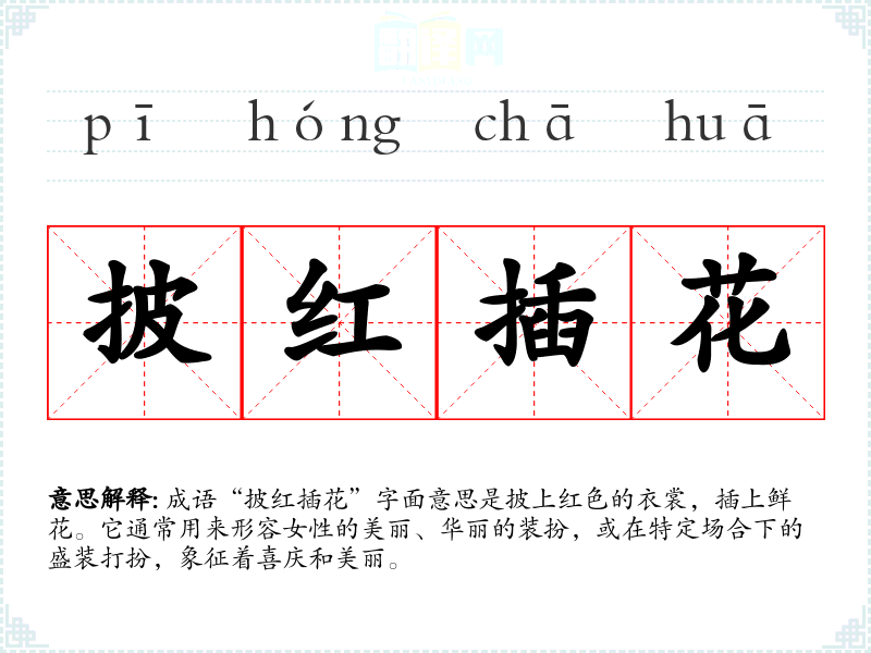 成语“披红插花”字面意思是披上红色的衣裳,插上鲜花。它通常用来形容女性的美丽、华丽的装扮,或在特定场合下的盛装打扮,象征着喜庆和美丽。