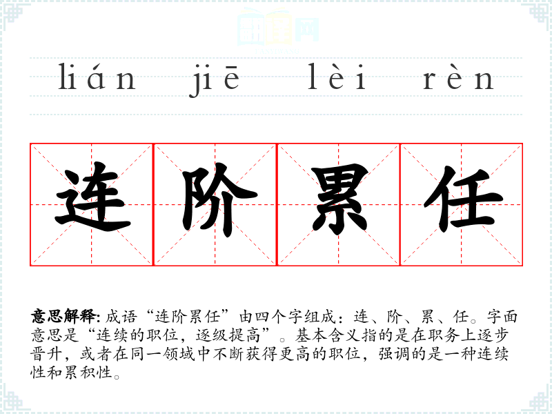 成语“连阶累任”由四个字组成:连、阶、累、任。字面意思是“连续的职位,逐级提高”。基本含义指的是在职务上逐步晋升,或者在同一领域中不断获得更高的职位,强调的是一种连续性和累积性。