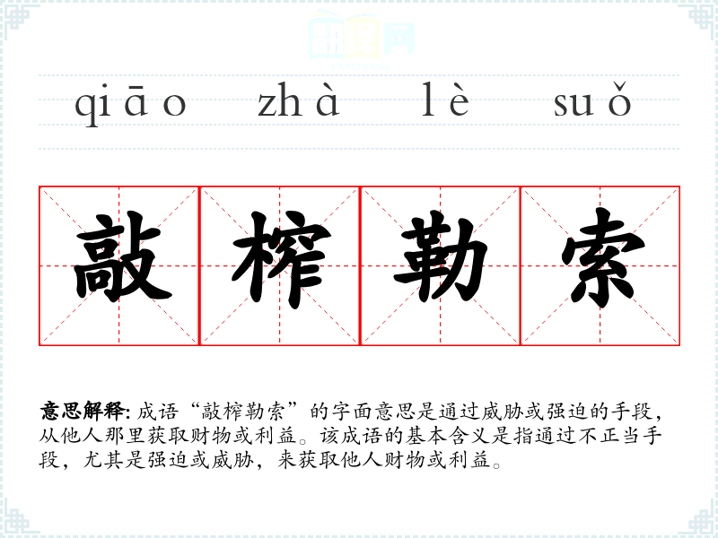 成语“敲榨勒索”的字面意思是通过威胁或强迫的手段,从他人那里获取财物或利益。该成语的基本含义是指通过不正当手段,尤其是强迫或威胁,来获取他人财物或利益。