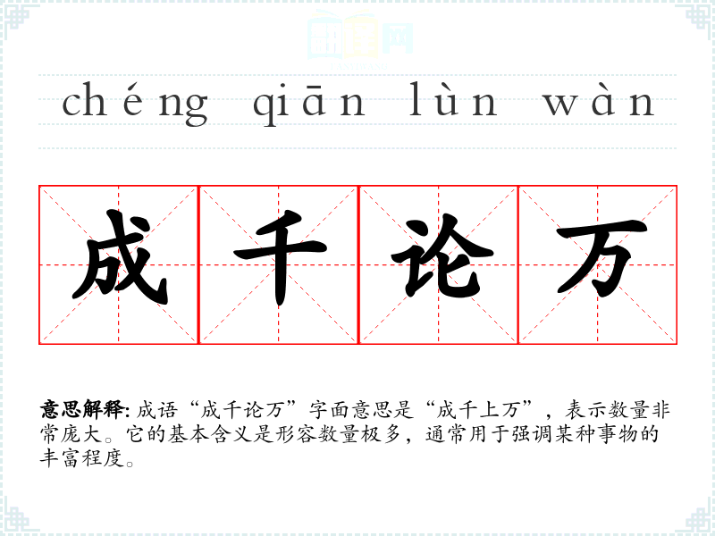 成语“成千论万”字面意思是“成千上万”,表示数量非常庞大。它的基本含义是形容数量极多,通常用于强调某种事物的丰富程度。