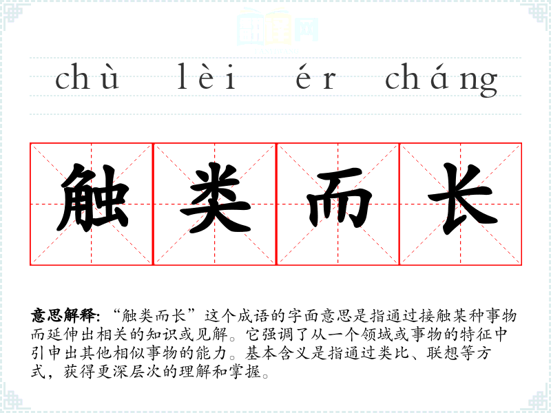 “触类而长”这个成语的字面意思是指通过接触某种事物而延伸出相关的知识或见解。它强调了从一个领域或事物的特征中引申出其他相似事物的能力。基本含义是指通过类比、联想等方式,获得更深层次的理解和掌握。