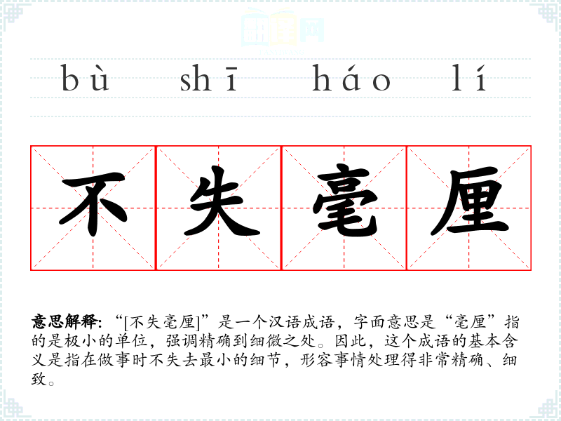 “[不失毫厘]”是一个汉语成语,字面意思是“毫厘”指的是极小的单位,强调精确到细微之处。因此,这个成语的基本含义是指在做事时不失去最小的细节,形容事情处理得非常精确、细致。