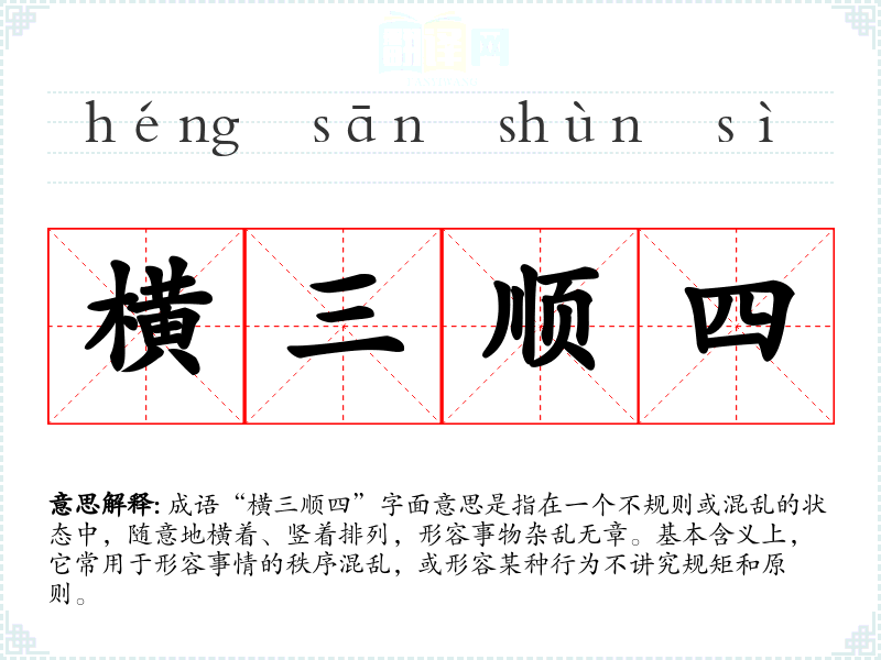 成语“横三顺四”字面意思是指在一个不规则或混乱的状态中,随意地横着、竖着排列,形容事物杂乱无章。基本含义上,它常用于形容事情的秩序混乱,或形容某种行为不讲究规矩和原则。