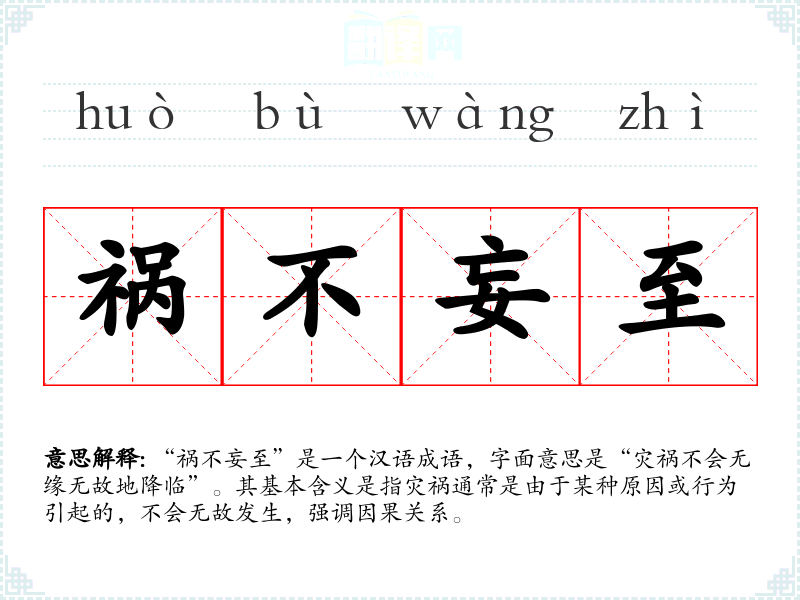 “祸不妄至”是一个汉语成语,字面意思是“灾祸不会无缘无故地降临”。其基本含义是指灾祸通常是由于某种原因或行为引起的,不会无故发生,强调因果关系。
