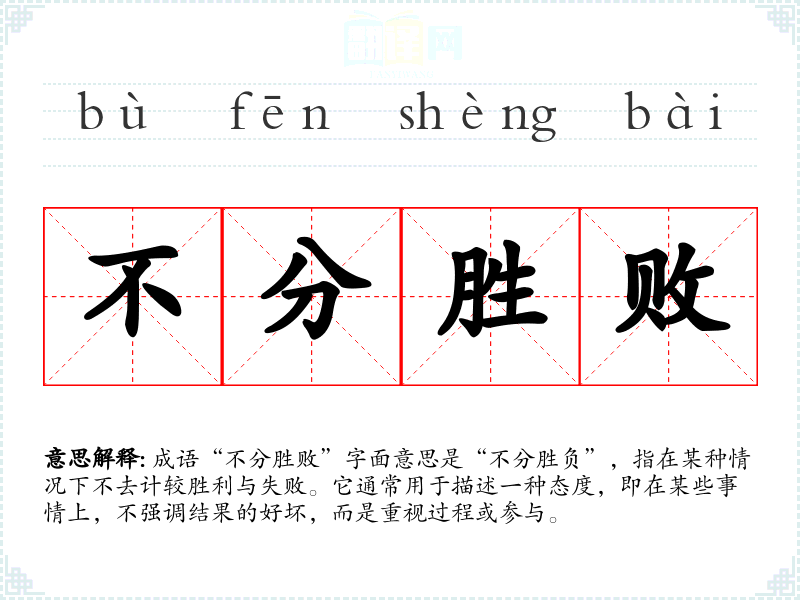 成语“不分胜败”字面意思是“不分胜负”,指在某种情况下不去计较胜利与失败。它通常用于描述一种态度,即在某些事情上,不强调结果的好坏,而是重视过程或参与。