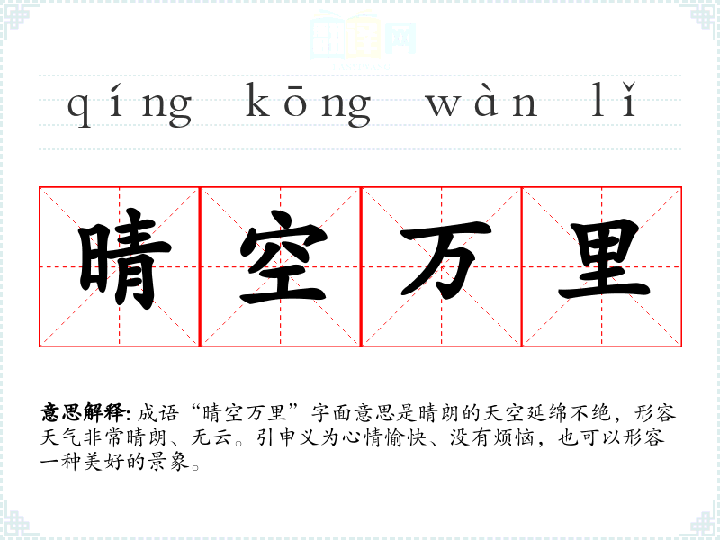 成语“晴空万里”字面意思是晴朗的天空延绵不绝,形容天气非常晴朗、无云。引申义为心情愉快、没有烦恼,也可以形容一种美好的景象。