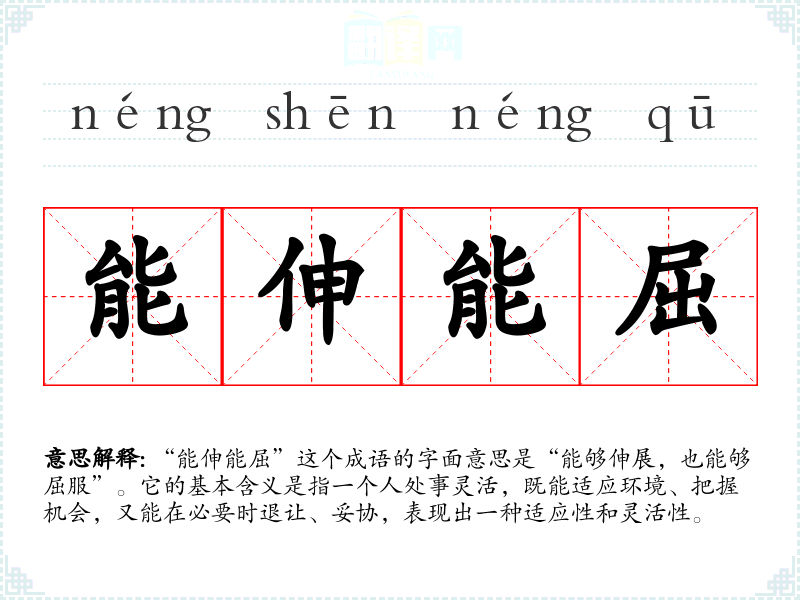 “能伸能屈”这个成语的字面意思是“能够伸展,也能够屈服”。它的基本含义是指一个人处事灵活,既能适应环境、把握机会,又能在必要时退让、妥协,表现出一种适应性和灵活性。